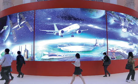 Visitors pass a huge display panel showcasing technological achievements at Beijing Exhibition Center in October. JIN LIWANG/XINHUA
